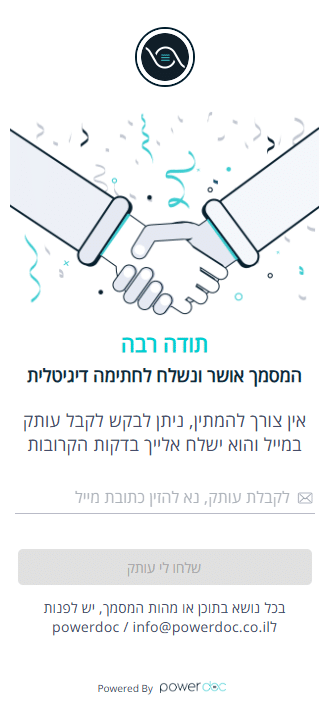 ההפניה מתבצעת אוטומטית מיד לאחר החתימה, ללא המסך להזנת מייל הלקוח לקבלת עותק